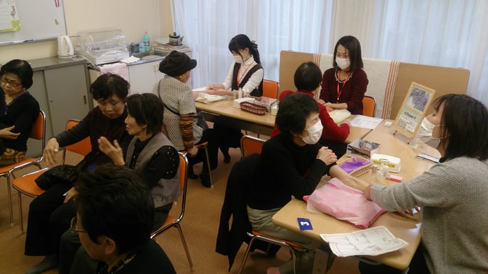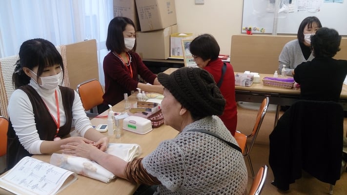 さて、当教室卒業生やボランティアに興味のある方々のご協力のおかげで毎月1回、名古屋市内の福祉会館でハンドトリートメントのボランティアをさせて頂いています。